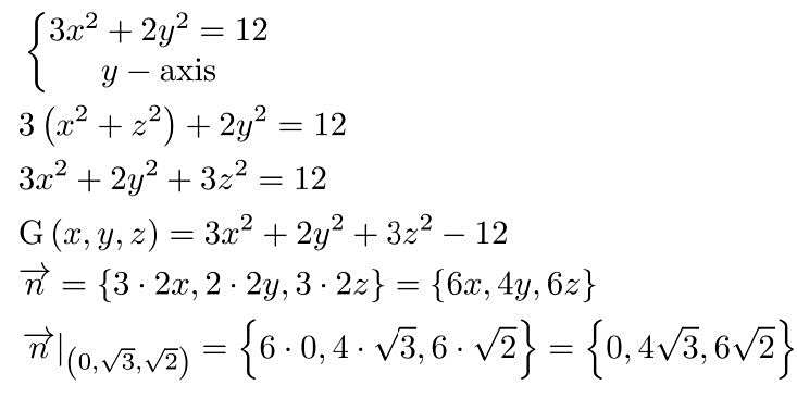 3x^2+2y^2=12,z=0饶Y轴旋转一周所得旋转曲面在点(0,根号3,根号2)处指向外侧的法