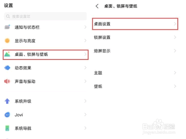 3、第四步:或者进入手机设置,点击桌面、锁屏与壁纸,然后在桌面设置进行设置。